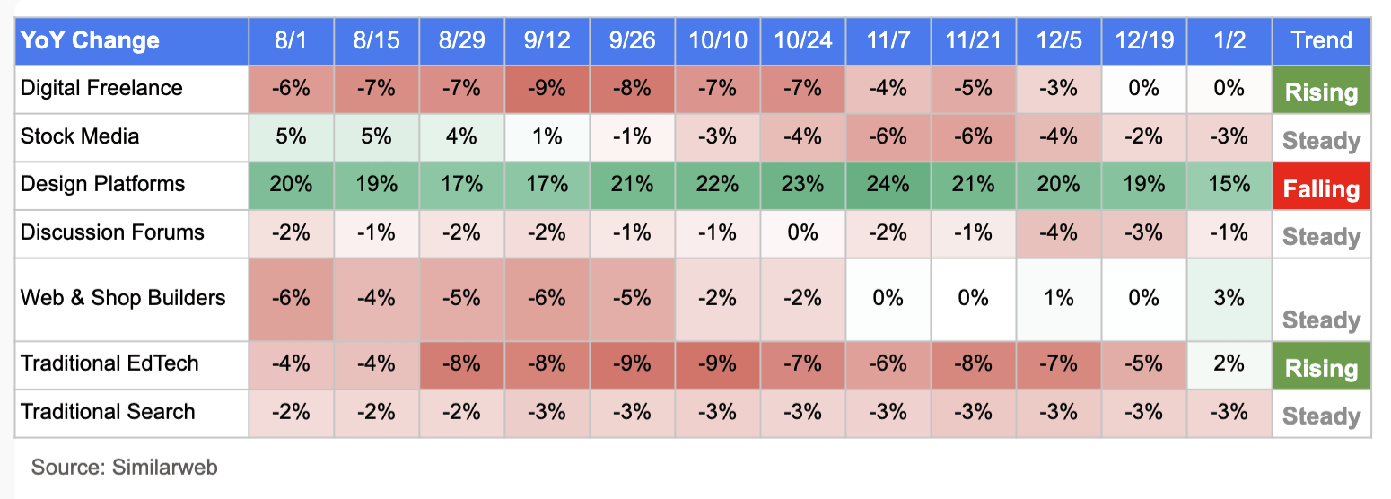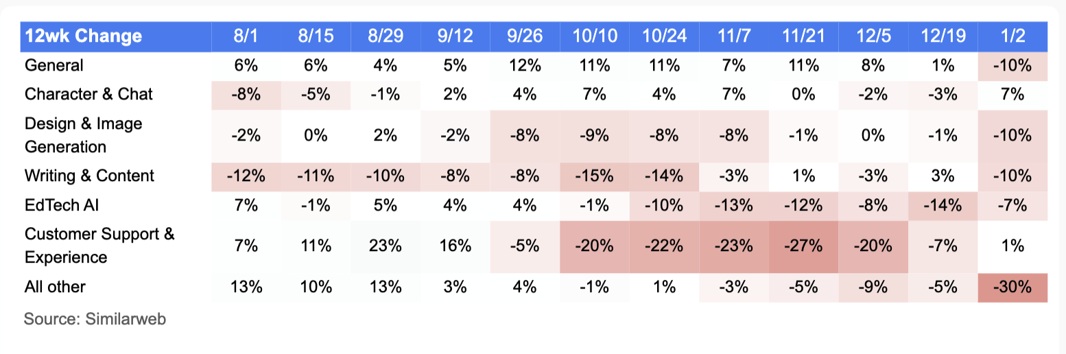 第二,合作红海/增加乏力赛道:通用AI、图像生成、写做东西、从动化东西增加放缓或下滑,