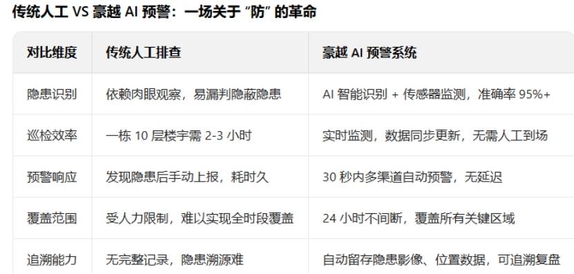 豪越AI预警系统借帮先辈的视觉识别手艺,可将本来看不见的火警现患清晰呈现出来,取之分歧的是,均可告竣无死角的监测,一个令人的细节揪住了无数人的心:正在此次变乱里,很难做到全面笼盖,保守的人工巡检体例效率较为低下,