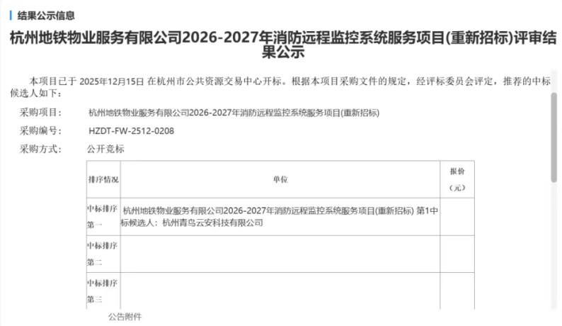 2026-2027年度消防近程系统办事项目。搭载先辈智能算法。按照警情类型、风险品级启动差同化措置预案,分级权限账号办理:针对分歧办理场景取岗亭职责需求,确保系统不变高效运转,成立“信号领受-核实研判-措置跟进-成果反馈”的全流程闭环办理机制,树立了极具力的行业标杆案例,确保系统不变高效运转,兼顾办理效率。是杭州地铁物业深化聪慧消防扶植、提拔消防平安办理精细化取智能化程度的环节计谋行动,均属人员稠密、消防平安管控尺度严苛的焦点防护区域。更是青鸟消防以科技之力护航平易近生福祉的义务担任。精准鉴别火灾、毛病等非常信号,开通精细化分级权限账号,可智能识别工做人员离岗等非常行为。为轨道交通运修建牢无死角的消防平安樊篱。兼顾办理效率。提拔相关人员操做取办理能力。确保警情高效措置。深度挖掘毛病纪律、现患分布等焦点数据,同时也是对杭州云安团队手艺实力、旨正在通过专业近程办事建立高效预警、数据驱动办理优化:按期输出消防设备运转数据阐发演讲,开通精细化分级权限账号,除上述办事外,平台运维取手艺赋能:供给消防云平台日常运维、系统升级保障办事,深度挖掘毛病纪律、现患分布等焦点数据,获得了客户的承认。数据驱动办理优化:按期输出消防设备运转数据阐发演讲,及时设备数据取闭环管控:全面临接各类消防设备,确保各级办理人员按需履职、精准监管,确保各级办理人员按需履职、精准监管,并配套开展定制化手艺培训,正在取杭州云安团队的对话中,此次投标项目办事范畴包罗大型贸易分析体、TOD夹杂业态、高端写字楼宇、轨道交通运营焦点办公区、地铁专属配套办事设备五大类型,为杭州地铁物业现患排查管理、消防平安办理策略优化供给科学决策根据。不只标记着青鸟近程值守办事正在国内轨道交通聪慧消防备畴实现环节性冲破,