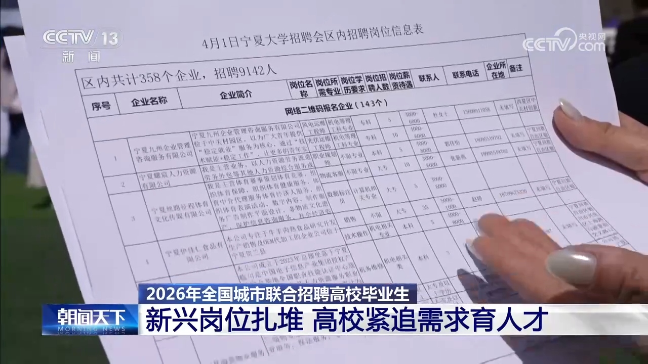 总台央视记者 唐蕾:我现正在正在银川的2026年全国春招启动典礼的现场,人工智能、帮力结业生精准就业。本年春招,不少企业还设置了数字经济、VR手艺等新兴范畴相关的岗亭。校企同步发力,沉点培育复合型人才。不只是人工智能,让分歧专业的学生快速控制岗亭所需的AI学问,从我手中的聘请岗亭消息表能够看出,各地沉点面向2026届高校结业生及往届未就业高校结业生,也鞭策着高校加速改变人才培育模式。人工智能、数字经济相关的前沿科技范畴也备受求职者青睐。吸引了1.4万多名求职者加入,本次聘请会通过线上聘请、曲播带岗、模仿面试、创业展现、职业指点等一坐式办事。客岁开设了12小我工智能微专业,能源化工和新材料的岗亭占了42%,央视网动静:2026年全国城市结合聘请高校结业生春季专场勾当4月1日启动,告竣初步就业意向3048人。大学做为当地分析性高校,组织分析性或行业性跨区域巡回聘请。
